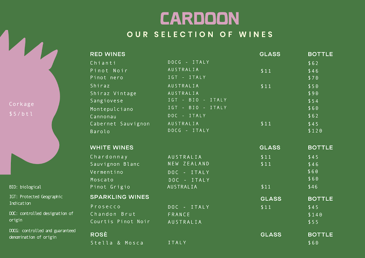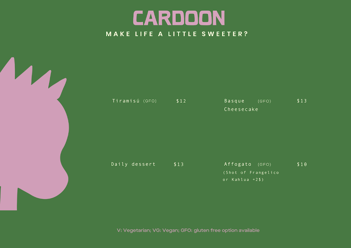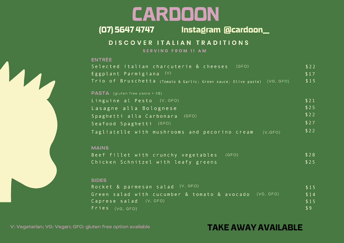The menu at Cardoon Cafe & Restaurant offers a variety of Italian-inspired dishes suitable for different dining occasions, including breakfast, light meals, and more substantial lunches or dinners. Visitors can find a selection of pastas, sides, and desserts, alongside specialty coffee and other beverages.